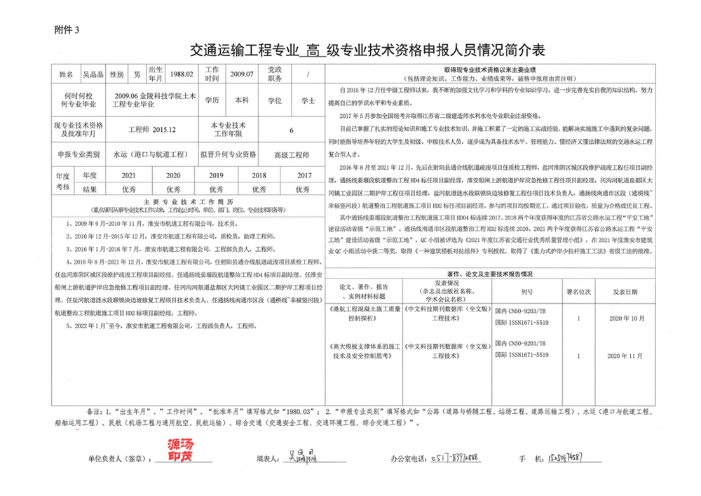 關(guān)于吳晶晶同志申報(bào)交通運(yùn)輸工程水運(yùn)(港口與航道工程)專業(yè)高級(jí)工程師的公…